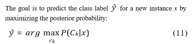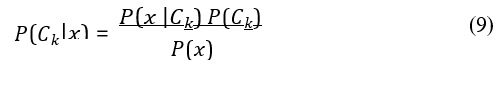 where: P(Ck | x) is the posterior probability of class Ck given featurevector x, P(x | Ck) is the likelihood of feature vector x given class Ck, P(Ck) is the prior probability of class Ck, P(x) is the evidence or marginal likelihood of feature vector x.