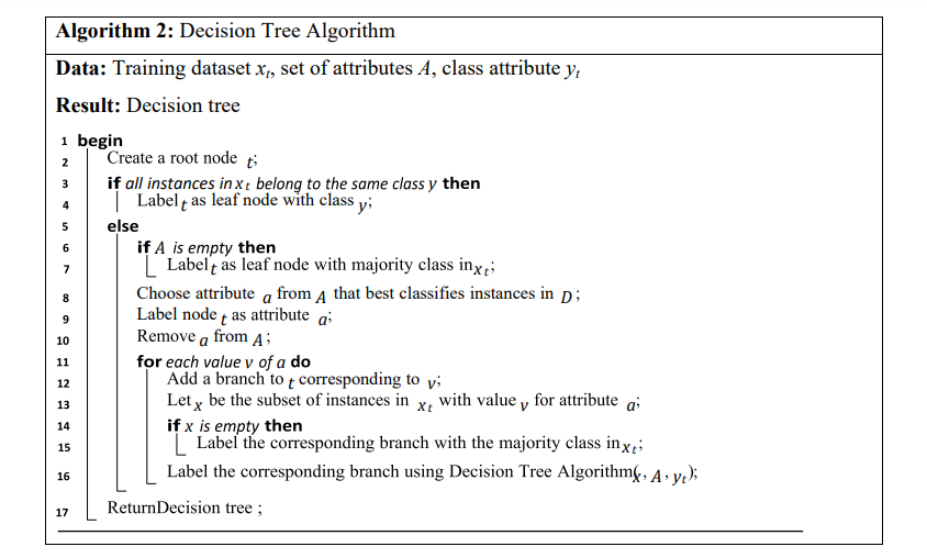 where xi is the feature vector for the i-th point, and yi is the classlabel (for classification) or value (for regression). Then a decision tree is a tree-like model where internal nodes represents a test on a feature, branches represents outcomes of those tests and leaf node represents a class label.