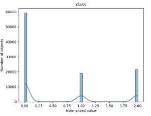 Additionally, we will provide histograms for SDSS-IV data, we will plot them on to one histogram, excluding redshift, which will be shown separately for clarity (figures 2a and 2b). We will also have a look at a number of each of the individual objects in our data (figure 2c) we can notice significant dominance of galaxies. Galaxies and quasars are similar in number, with a small margin for stars.