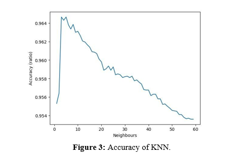 • For KNN we get 96.465% accuracy, which was best for numbers of neighbors equal to 3 as shown in figure 3 with confusion matrix as in figure 4a.