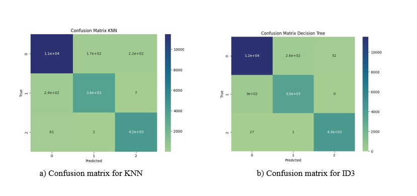 Figure 4: Comparison of confusion matrices for KNN, ID3, and Naive Bayes Algorithms (0 - galaxies, 1 - QSOs, 2 - stars).