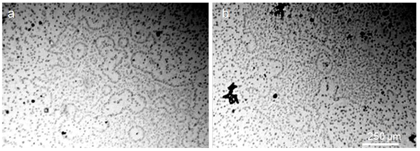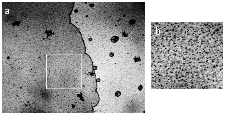 Figure 5: Microphoto of a part of the “crushed drop” preparation (Figure 4) in the process of evaporation of the liquid phase. Fragment a: on the right (light part) - an evaporating liquid; on the left (dark part) the dispersed phase of water settling on a substrate; b - fragment a, limited by a light square, at higher magnification. Frame width “a” is 3 mm [60]