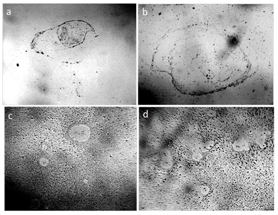 Figure 6: Aggregates of the dispersed phase in dried smears: a- distilled water; b - dry white wine; c, d - water solution of “Nescafe Gold” freeze-dried coffee. Microphoto. The width of each frame is 3 mm [61]