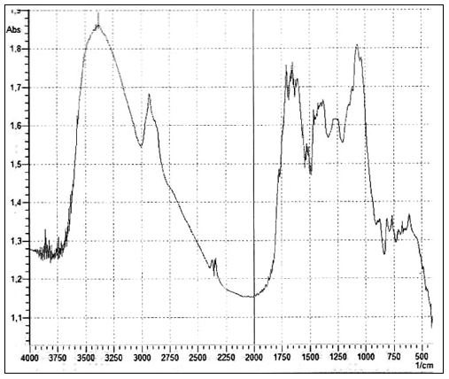 Based on the features of the IR spectrum, the deconvolution of the OH stretching peak between 2880 and 3800 cm– 1 shows the complete disappearance of the higher energy component by about 3600 cm– 1 relative to bulk water [75]. This feature is characteristic of OH stretching in ice. It is also noted that “Other features appearing at 1418 cm-1 and 1105 cm-1, that are not present in liquid water, are dificult to attribute univocally at the present stage of knowledge.” [74, p. 22]. Let us recall that the authors of the discovery of polywater faced a similar problem more than 50 years ago: "the complete absence of absorption from 2500 to 4000 cm-1, the presence of a strong band at about 1595 cm-1 and an intense doublet in the region of 1400-1" [17]. And further:“… we believe that water is restructured on the fused quartz or Pyrex surface into a polymeric form with bonds and bond energies completely different from that of ordinary water. Its properties are not those of water, and it should not be considered to be or even called water, any more than the properties of the polymer polyethylene can be directly correlated to the properties of the gas ethylene. In the case of the formation of polyethylene, a bond change occurs. In the case of polywater, a bond change also occurs, although it has previously been unknown. … Vibrational spectra indicate unique stable polymeric structure” [17, p. 1486]. As you can see, the authors of the discovery of "polywater" also obtained it upon contact of ordinary water with hydrophilic surfaces - fused quartz and glass. Let us return to the publication by Lo et all [68]. The structures discovered by the authors - stable water clusters -at room temperature also had characteristic differences in the IR spectrum from ordinary water: the absorption peaks for pure water are 3283.5 cm- 1 and 1634.5 cm- 1. The absorption peaks for stable-water-clusters are 3371.4 cm- 1, 1639.5 cm- 1, 1342 cm- 1, 822.5 cm- 1. We see the same "red shift" and characteristic absorption for "water structures" obtained by other authors. The IR spectrometric analysis of the Nescafe Gold coffee solution1, in which we clearly observed aggregates of the dispersed phase of liquid crystalline water, revealed similar shifts [67]. To obtain the IR spectrum, a part of the sample dried to constant weight was ground in an agate mortar with a certain amount of KBr powder and pressed into a tablet. The IR spectrum was recorded on an IRRAFINITY-1 instrument (Shimadzu) in the range of wave numbers 400 - 4000 cm- 1. The spectrum of a pure KBr tablet was used as a background. In Figur 13 shows the IR spectrum of the sample at room temperature. It can be seen that, along with residues of free water (3381.2 cm- 1), there are bands characteristic of structured water (~ 1600 cm- 1, ~ 1400 cm- 1, ~ 1100 cm- 1).