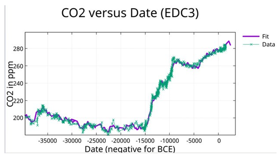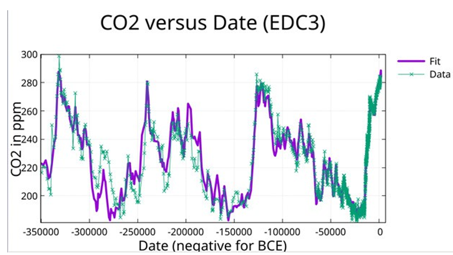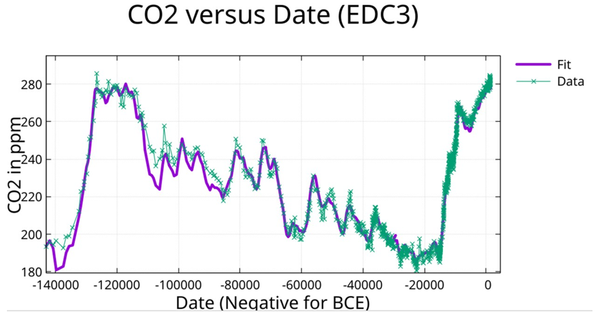 The CO2data was fit to the same 55 periods with constant, allowing only amplitudes and phases to vary. Data after 1515 CE was excluded. The truncated fit achieves R² = 0.964, with maximum off-diagonal correlation |r| = 0.52. See Supplementary Table S2 for fit parameters. The fit involved 1,130 data points.
