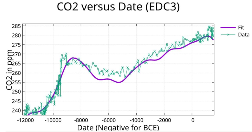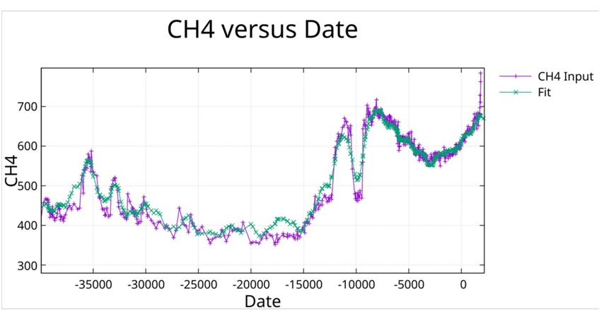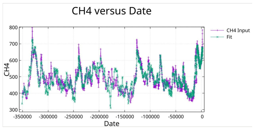 • CH4: EPICA Dome C methane record, EDC3 gas age chronology, matching the temperature chronology. The fit involved 1,418 data points from 350,000 BCE to 1824 CE [10].
