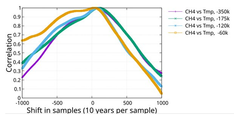 Figure 20: The Times Series for Temperature and CHâ?? for Intervals, 350,000 BCE -1850 CE, 175,000 BCE – 1850 CE, 120,000 BCE – 1850 CE, and 60,000 BCE – 1850 CE, were Cross Correlated. All Cases Show a Lag with Respect to Temperature
