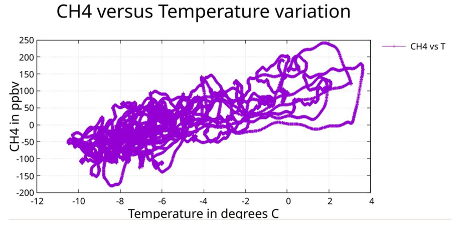 The linear CH4-temperature relationship in cross-plot analysis (Figure 22) contrasts with the hysteresis evident in cross- correlation, suggesting, but not proving, that CH4 variability arises from source heterogeneity (wetlands, permafrost, clathrates) rather than from nonlinear temperature response.