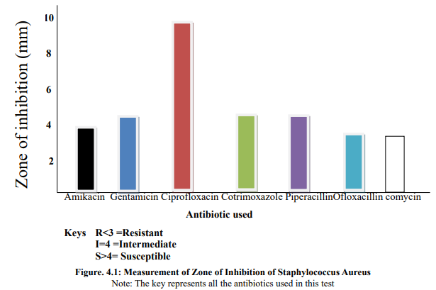 FIG. 4.1, using duplicated plates (two culture plate) on the measurement of zone of Inhibition of Gram positive organisms, mental rule was used for the measurement of zone of inhibition. Amikacin, Ofloxacillin and Vancomycin were resistant to Staphylococcus aureus. Gentamicin, Cotrimoxazole and Piperacillin were intermediate on Staphylococcus aureus while Ciprofloxacin was susceptible to Staphylococcus aureus. Hence, it can be deduced that antibiotic has less reactivity on Staphylococcus aureus compare to Staphylococcus epidermidis.