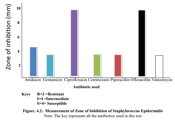 FIG. 4.2, using duplicated plates (two culture plate) on the measurement of zone of Inhibition of Gram positive organisms, mental rule was used for the measurement of zone of inhibition. Gentamicin, Cotrimoxazole, Piperacillin and Vancomycin was resistant to Staphylococcus epidermidis. Amikacin was intermediate on Staphylococcus epidermidis while Ofloxacin, and Ciprofloxacin were susceptible to Staphylococcus epidermidis. Hence, it can be deduced that antibiotic has moderate reactivity on Staphylococcus epidermidis compare to Staphylococcus aureus.