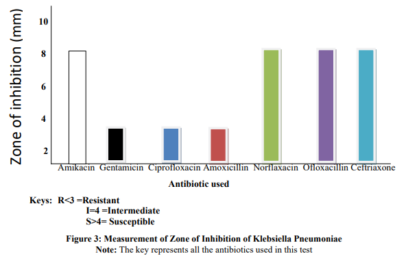 FIG. 4.3, using duplicated plates (two culture plate) on the measurement of zone of Inhibition of Gram negative organisms, mental rule was used for the measurement of zone of inhibition. Gentamicin, Ciprofloxacin and Cephalexin Amoxicillin, was resistant to Klebsiella pneumoniae while Norfloxacin, Ofloxacin, Ceftriaxone, Ciprofloxacin and Amikacin were susceptible to Klebsiella pneumonia but of the antibiotic has intermediate reaction on Klebsiella pneumoniae. Hence, it can be deduced that antibiotic is highly susceptible to Klebsiella pneumoniae.