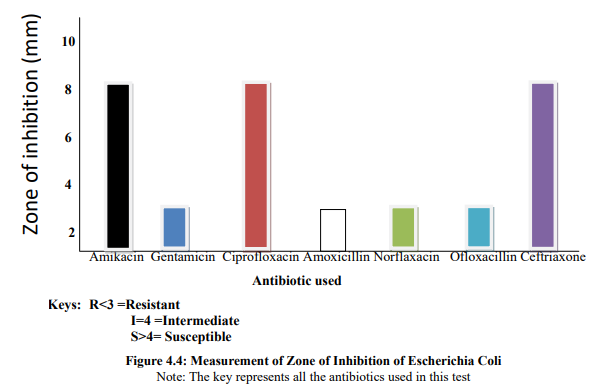 FIG. 4.4, using duplicated plates (two culture plate) on the measurement of zone of Inhibition of Gram negative organisms, mental rule was used for the measurement of zone of inhibition. Gentamicin, Norfloxacin, and Cephalexin Amoxicillin, was resistant to Escherichia coli Ofloxacin was intermediate on Escherichia coli while Ceftriaxone, Ciprofloxacin and Amikacin was susceptible to Escherichia coli. Hence, it can be deduced antibiotic has moderate reaction or susceptible to Escherichia coli