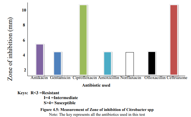 FIG. 4.5, using duplicated plates (two culture plate) on the measurement of zone of Inhibition of Gram negative organisms, mental rule was used for the measurement of zone of inhibition. Gentamicin, Ofloxacin , Ceftriaxone and Cephalexin, was resistant to Citrobacter spp. Amikacin and Ciprofloxacin was intermediate on Citrobacter spp while Amoxicillin and Norfloxacin was susceptible to Citrobacter spp. Hence, it can be deduced antibiotic is less susceptible to Citrobacter spp