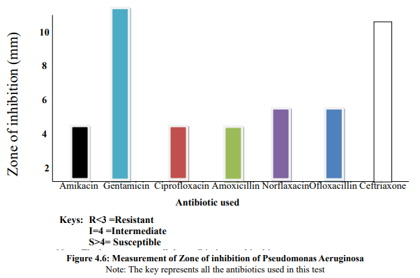 FIG. 4.6, using duplicated plates (two culture plate) on the measurement of zone of Inhibition of Gram negative organisms, mental rule was used for the measurement of zone of inhibition. Amikacin, Cephalexin, Ciprofloxacin and Amoxicillin was resistant to Pseudomonas aeruginosa. Norfloxacin and Ofloxacin was intermediate on Pseudomonas aeruginosa while Gentamicin and Ceftriaxone was susceptible to Pseudomonas aeruginosa. Hence, it can be deduced antibiotic is less susceptible to Pseudomonas aeruginosa