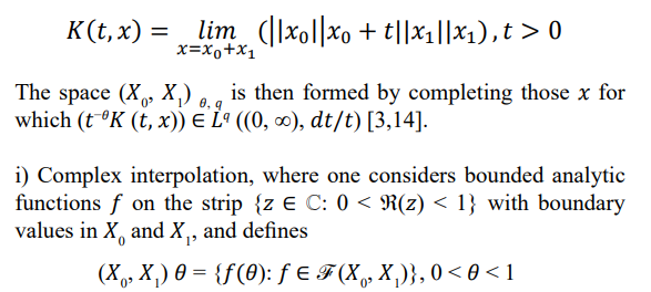 i) Real interpolation (the K methods and J methods), where norms are defined by functionals such as