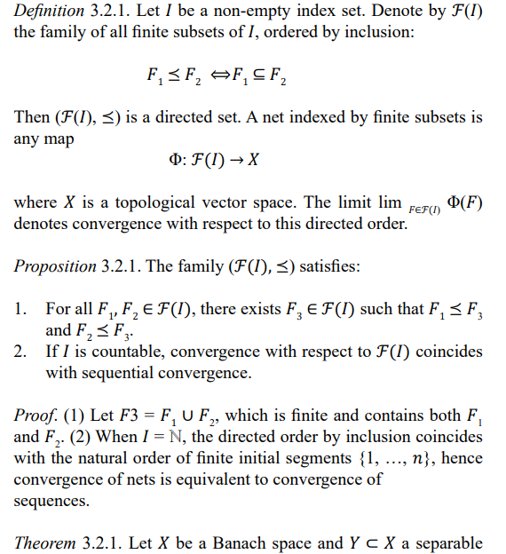 These limitations motivate the introduction of a net-based approach, in which convergence is indexed not by natural numbers but by finite subsets of an arbitrary index set. Nets generalize sequences while preserving the order structure needed for analytical approximation. At the same time, since every countable subset of a Banach space generates a separable subspace, one can perform local analysis within such subspaces and then reconstruct the global structure by consistency. This dual strategy—replacing sequences with nets and combining local separable analysis with global coherence— forms the basis of the new framework developed in this section.