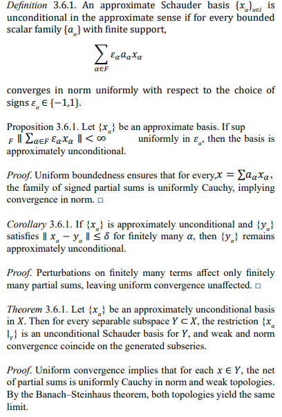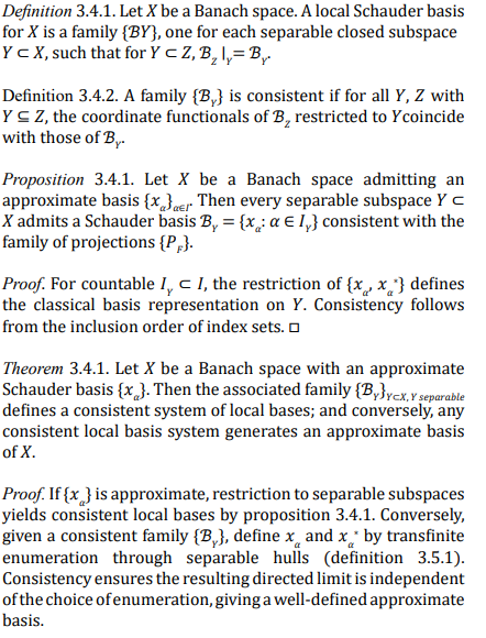 1. Approximate Schauder Bases: replacing classical sequential expansions by net-based approximations valid across separable subspaces.