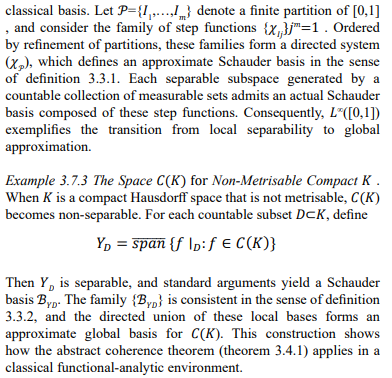 The preceding discussion highlights both the power and the limitations of classical Banach space theory. Schauder bases and interpolation methods provide a complete and elegant structure in separable settings, but their reliance on sequential compactness and countable density prevents their direct extension to non-separable Banach spaces. In order to recover analogous structural tools, it becomes necessary to generalize the notions of expansion and interpolation beyond sequences, replacing them with nets and local analysis on separable subspaces.
