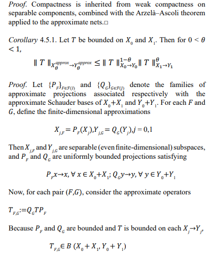 Proof. Boundedness follows from the approximate Riesz–Thorin inequality [7]. Compactness follows from weak compactness on separable components combined with the Arzelà–Ascoli argument for directed approximation nets.