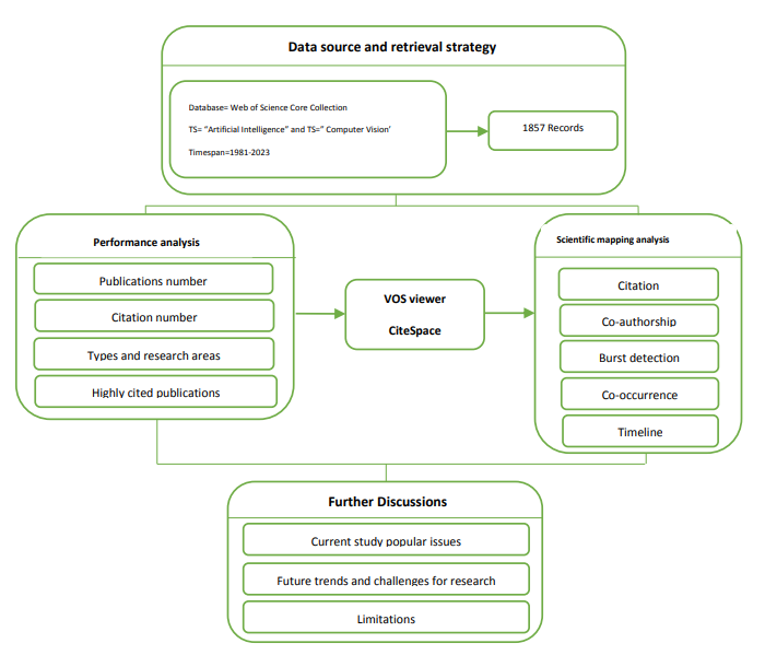 The purpose of this study is to give a comprehensive bibliometric analysis of research in AICV. Firstly, publications relevant to the study are extracted from a high-quality database by using a retrieval strategy. Next, is the analysis and description of important features of the publications such as annual indicators, citation index of publications, publications research type and areas. Furthermore, the implementation of complementary bibliometric methods and tools are used to find out highly productive and impactful authors, countries, institutions, and the collaborative relationships between them in the study [30]. In addition, hotspots, future trends and research frontiers are also identified. Lastly, the study discusses the present-day topical issues, prospective trends, challenges and limitations. Figure 1 shows the research framework