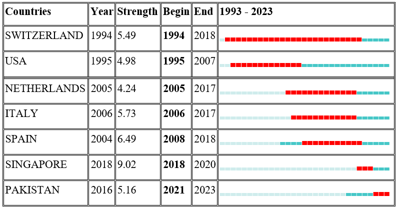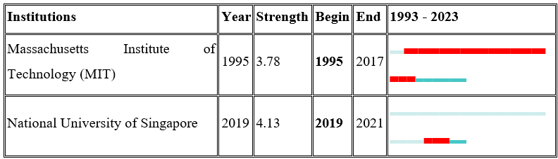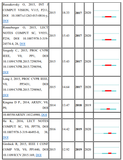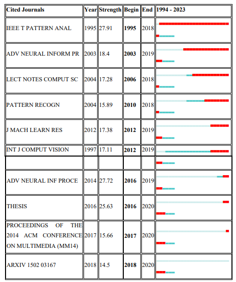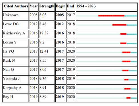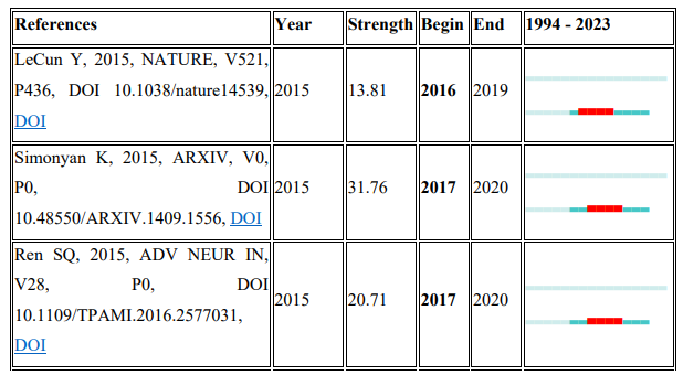 3) From the burst detection analysis, a corporate author presumably takes the lead of influence and impact for 12 years. LeCun (2015), Simonyan (2015), and Ren (2015) are highly referenced reputable authors in the field. In terms of Journals, IEEE Transactions On Pattern Analysis and Machine Intelligence was the most cited journal by researchers for 23 years. Additionally, Switzerland and Massachusetts Institute of Technology (MIT) are respectively the country and institution with an impact in the field over a long period of time.