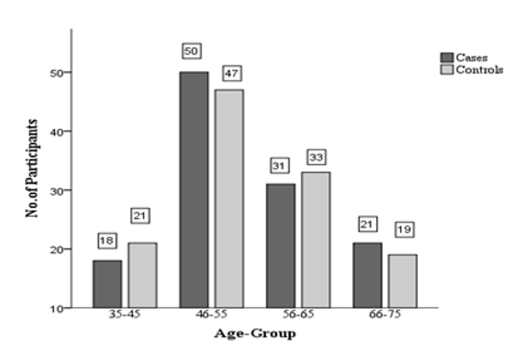 In this study 120 T2DM patient with mean age of 54.83 ± 9.578 years as cases and 120 apparently healthy participants with mean age of 54.63 ± 9.44 years as control were recruited. Among them, the numbers of male and female were 129 and 111 respectively Table 1. Most of T2DM patients and controls were from 46-55 years of age group. Similarly, the least number of cases and controls belong to age group of 35-45 years and of 66-75 years, respectively in Figure 1.