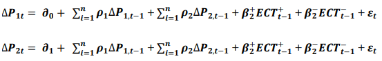 ECT+t-1 + ECT -t-1= ECT, the standard symmetric VECM is nested in the AVECM and the F-test to test the null hypothesis of symmetry H0 : ß2+ = ß2−. If this is rejected then price transmission process among the market is asymmetric [24].