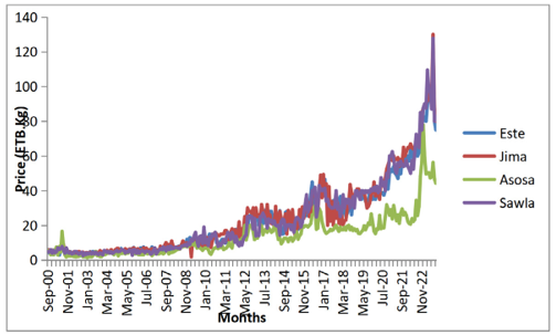 Understanding price behavior in various markets has been closely linked to the concept of price variability. This variability can be attributed to a range of factors, including natural influences like weather fluctuations, as well as economic factors such as transportation expenses, market participants, and alterations in market structure. According to Table 1, Diredawa and Addisababa exhibited the highest nominal mean prices at 29.89 and 28.69 ETB per Kg respectively, whereas Asosa and Este showed the lowest mean prices at 13.49 and 22.83 ETB respectively. The high prices in both Diredawa and Addisababa were as a result of urban demand of groundnuts that outpaced supply [25]. The low prices recorded in Asosa, Sawla and Este can be attributed to the fact that the markets are located in the main groundnut growing regions across the country.
