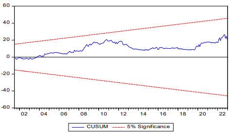 Figure 8: The Cumulative Sum of Error Forecast (CUSUM) test to estimate the Stability of NARDL model