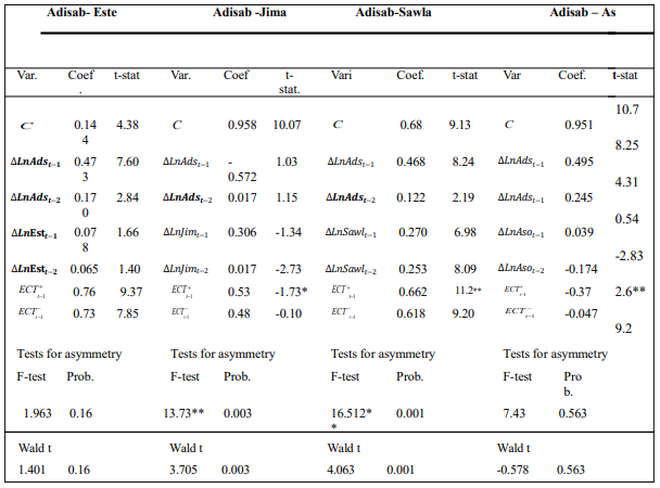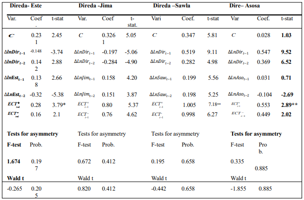 The F-statistic value for the non-linear ARDL falls between the upper and lower bounds, it implies that the relationship between Change in price and its determinants is inconclusive. However, for the asymmetric NARDL, bounds test result shows that there is evidence of cointegration among Diredawa-Este, Diredawa-Jima, Diredawa-Sawla, Diredawa-Asosa, Addis ababa-Este, Addis ababa-Jima, Aaddisababa-Sawla and Adis ababa-Asosa Market.