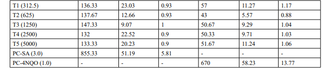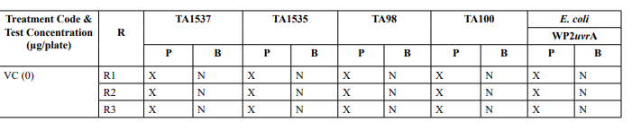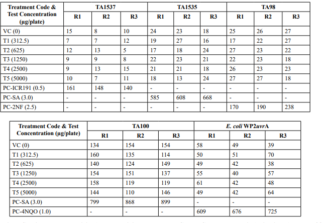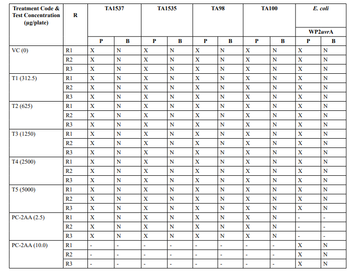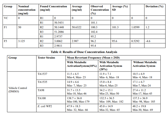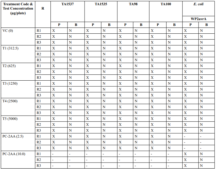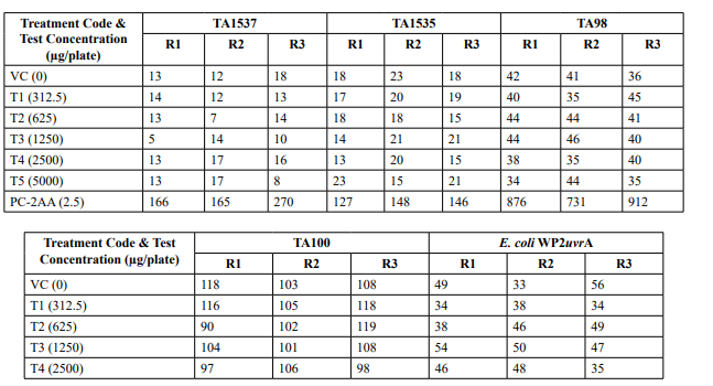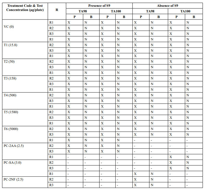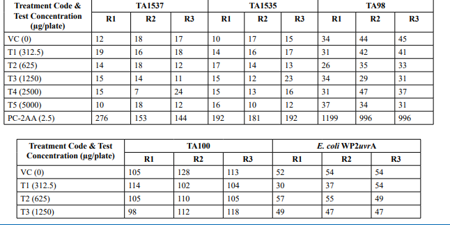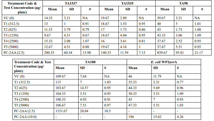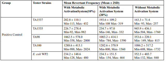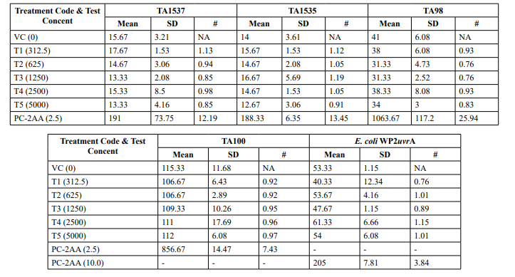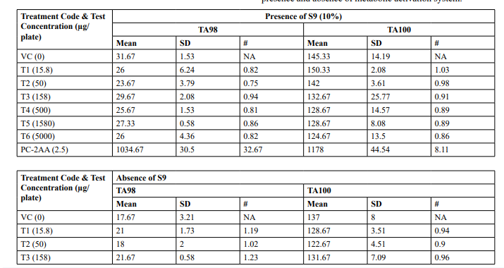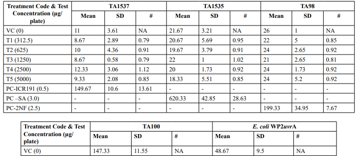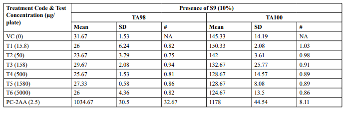 Table 2: Mutagenicity Assay - Mean Revertant Frequency Metabolic Activation: Presence of S9 (10%)