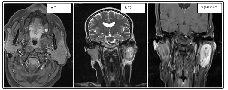 Figure 1: (A, B, C): Intraparotid image encapsulated in hyposignal in T1 and hypersignal in T2