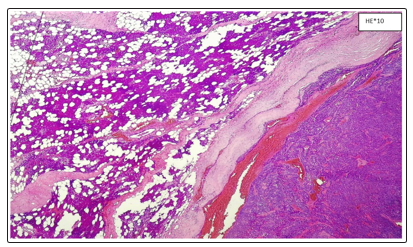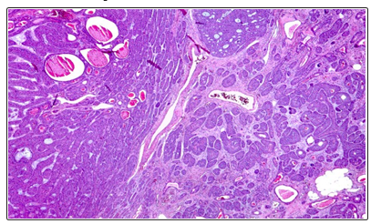 Figure 3: Encapsulated Benign Tumor Proliferation Of Compact Architecture, In Situ Clusters And In Channels With Eosinophic Content