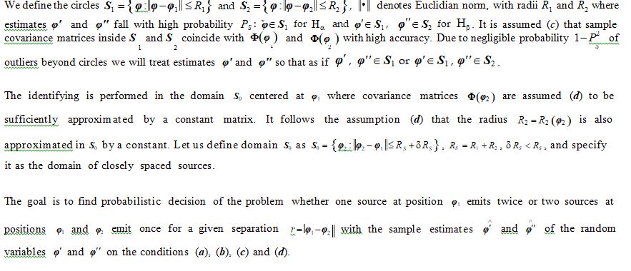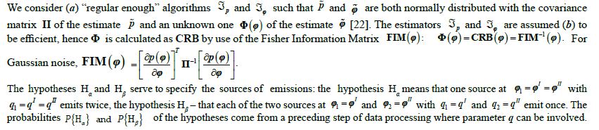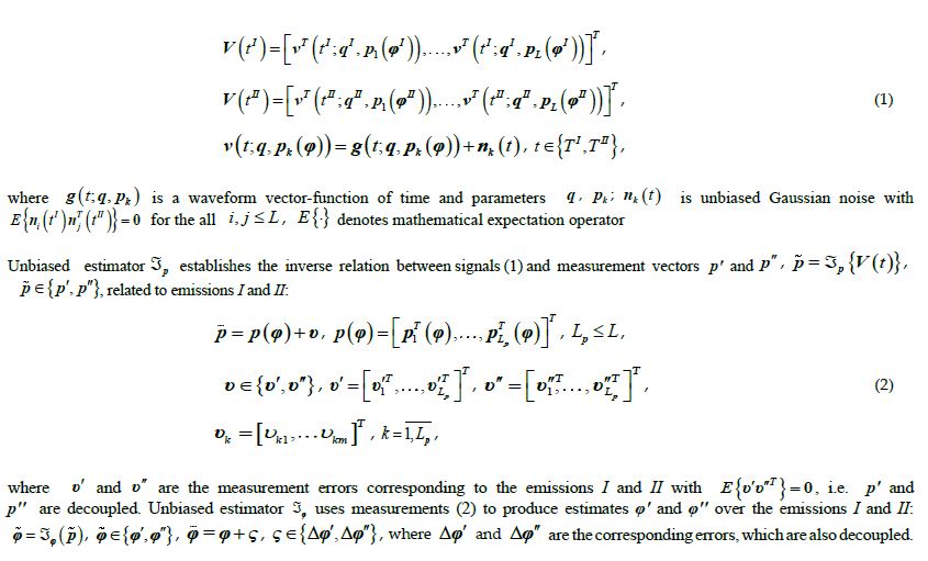 During two consecutive time intervals T 1 and T II : T I T II = Æ, t I ÎT I , t II ÎT II , L signals from emission I and L signals from emission II are received. The k - th signal depends upon vector parameter q , q Î{qI ,qII }, gathering physical characteristics of the emissions, and m - dimensional measurement parameter pk (φ) which is a known smooth function of a two-dimensional unknown vector of the source location, φ Î{φI , φII }: