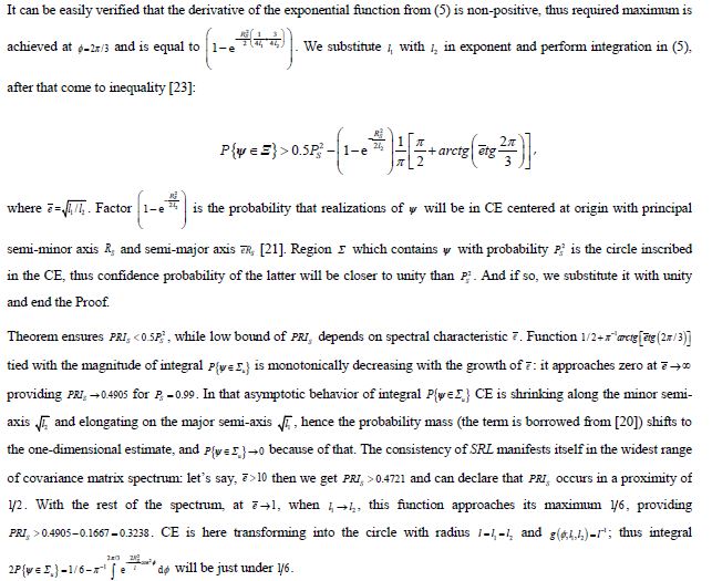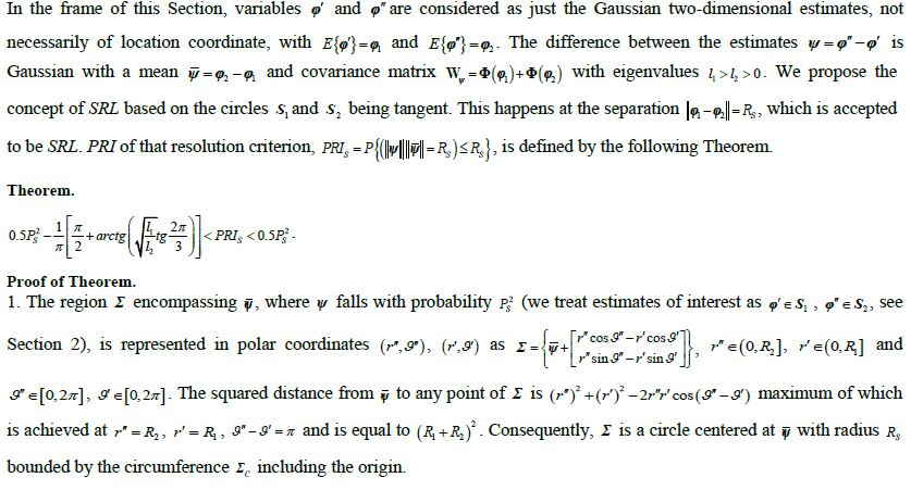 1 £ SRL , could hardly be determined here in comparison with the scalar resolution criteria. Clark analyzing the resolution of estimator that produces vector decoupled Gaussian estimates offered weighted Euclidian metric of the distance between ellipsoidal confidence regions of probability 0.9 around each of the two parameters (really, Clark deals with the multiple vector parameter) [20]. The estimates are resolvable when the ellipsoids are disjoint. At the “resolution threshold” metric of the separation to the ellipsoids will be zero, and by this metric they will be tangent, but it is also not suitable to reach PRI unlike scalar case.