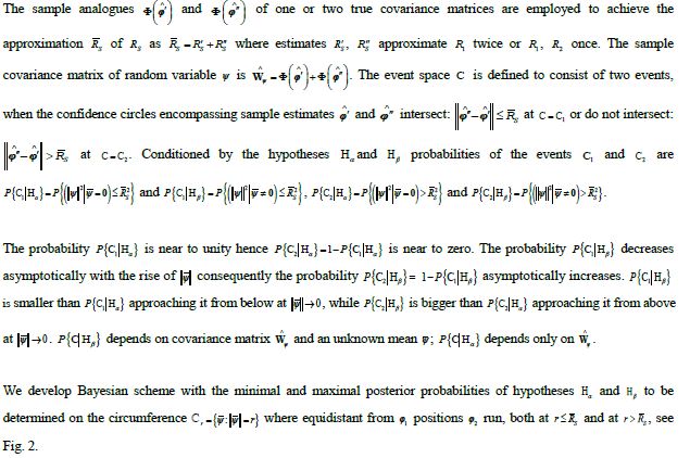 Bayes event space consists of two mutually exclusive events: when confidence circles around sample estimates intersect or do not intersect, accordingly when the distance between them is below or over SRL. The extreme probabilities of the events conditioned by one/two-sources hypotheses depend on the distance between locations of hypothesized sources which may be taken both below and over SRL.