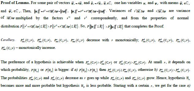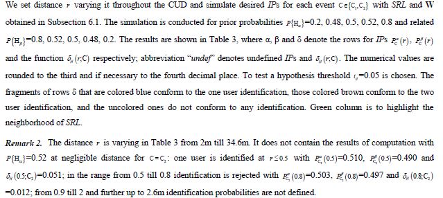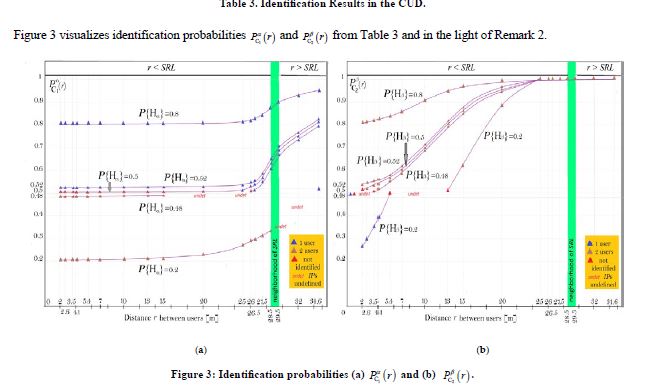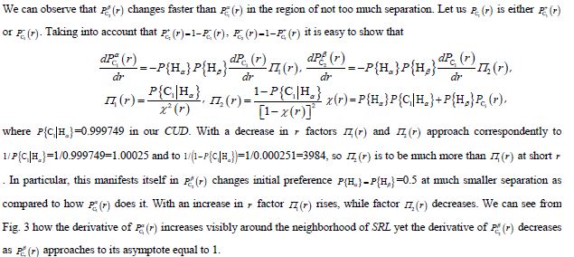 For equally probable hypotheses initial probabilities both are equal to 0.5. The probability of one user at C = C1 increases with distance while of two users – decreases. Beginning from big enough distance below SRL PS-decision (which is no preference herein) is changed in favor of one user; at smaller distances preference is impossible. The probability of two users at C = C2 increases with distance while of one user – decreases. Beginning from small enough distance PS-decision is changed in favor of two users; before that distance preference is impossible.