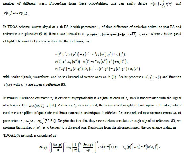 The rest of the paper is organized as follows. The problem is described in Section 2. New concept of SRL is founded in Section 3. Section 4 contains the design of Bayesian identification technique. The algorithm for estimation of R99 is presented in Section 5. Proposed technique as applied in TDOA BSs network is quantitatively studied in Section 6. Section 7 briefly draws the summary of the paper.
