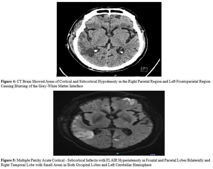 Patient underwent right FTP mini craniotomy and clot evacuation. On post-operative day 2 patient had a seizure and hyponatremia with serum Na 127 meq/L which was managed conservatively. On post-operative day 6 patient developed severe sepsis and was electively intubated due to breathing difficulty. Patient developed transient hemiparesis lasting for 24 hours. CT Brain done showed multiple hypodensity areas in frontal, temporal and parietal region. MRI Brain revealed acute cortical - subcortical infarcts in frontal and parietal lobes bilaterally and right temporal lobe with small areas in both occipital lobes and left cerebellar hemisphere.