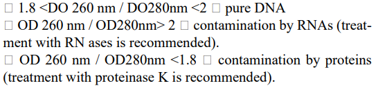 A dilution of 1/50 of the DNA extract by adding 50 µl of the DNA solution in 950 µl of double-distilled water is carried out. A first reading of the optical density (OD) at 260mm makes it possible to assess the DNA concentration of the sample, 1 unit OD 260 nm -> 50 µg / ml of double-stranded DNA. DNA concentration µg / ml = OD value * 50 * dilution factor Asecond reading of the OD at 280 nm allows the protein con- tamination to be estimated and the calculation of the OD at 260 / OD at 280 ratio allows the purity of the DNA to be assessed. A DNA is considered pure when this ratio is between 1.8 and 2. The optical density is read by a conventional spectrophotometer. Thus, depending on the value of the report, possible contami- nants such as proteins or RNAs are detected: