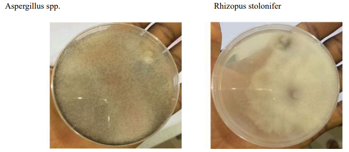 The fungal growth observed in the pure culture was identified as described by CMI (2010). Identification was done microscopically and macroscopically. Colony characteristics such as appearance, change in medium colour and growth rate were observed. Shape of the conidia and conidiophores were taken note of. These features were matched with standards.