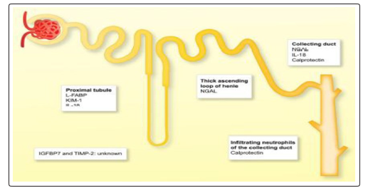 Figure 1: Sites of origin of AKI biomarkers. L-LABP: Liver-Fatty Acid Binding Protein, KIM-1: Kidney Injury Molecule-1, NGAL: Neutrophi Gelatinase Associated Lipocalin, IL-18: Interleukin-18, IGFBP7: Insulin-like Growth Factor-Binding Protein7, TIMP2: Tissue Inhibitor of Metalloproteinases 2.