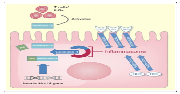 Figure 5: Schematic model of the functions of IL-18. RIG: Retinoic acid-induced gene-like receptor, TLRs: Toll-like receptors, SR: Scavenger receptors, CLR: Cell-type lectin receptor, NLR: nucleotide-binding domain-leucine-rich repeat [4].