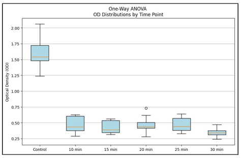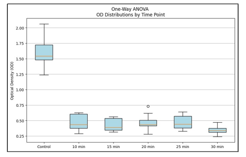 One-way ANOVA (Figure 1) confirmed significant differences among groups (F = 317.81, p < 0.0001), supported by the Kruskal-Wallis test (H = 43.97, p < 0.001) (Figure 2). Tukey’s HSD posthoc analysis revealed that all treatment groups were significantly different from control (adjusted p < 0.001), and that the 30-min treatment produced a significantly greater reduction than 10 and 15min exposures (adjusted p < 0.05). No significant differences were observed among the intermediate durations (10-25 min) (Table 2).
