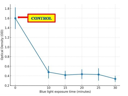 A key advantage of blue light therapy is its multifactorial mode of action. Unlike conventional antibiotics that target specific molecular pathways, ROS-mediated damage affects multiple cellular components simultaneously, making it difficult for bacteria to mount stable resistance [18,19]. This may account for the consistent and reproducible reductions we observed across independent experiments. Moreover, the plateau in optical density reduction after shorter exposures (10-25 minutes), followed by a significant additional decline at 30 minutes, reflects the time-dependent kinetics of ROS accumulation, where sustained irradiation is necessary to achieve maximal oxidative stress and biofilm disruption [19,29].