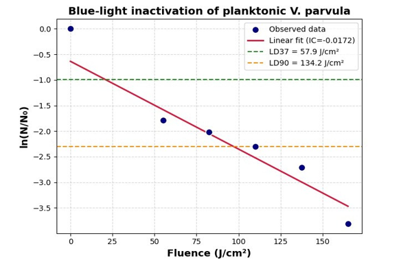 From this slope, the lethal dose values were derived as follows: • LD37: 57.9 J·cm-² (≈10.5 min) • LD90: 134.2 J·cm-² (≈24.4 min)