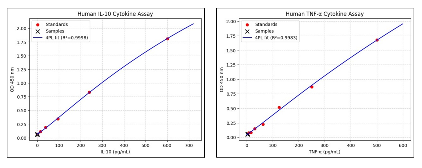 Figure 8: (a) IL-10 ELISA standard with sample readings (b) TNF-alpha ELISA standard with samples.