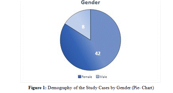 Out of 50 cases, 42 were females and 8 were males, with a male- to-female ratio of 1:5 (figure 1).