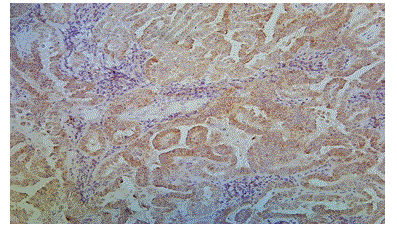 Figure 7: Photomicrograph Showing Papillary Thyroid Carcinoma with Moderate and Diffuse Cytoplasm Positivity for BRAF V600E