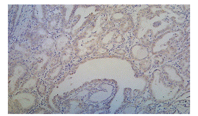 Figure 9: Photomicrograph Showing Papillary Thyroid Carcinoma with Weak and Diffuse Cytoplasm Positivity for BRAF V600E (case
